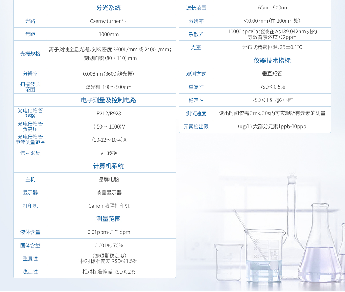 3、光學(xué)系統(tǒng)    3.1 新一代中階梯光柵及棱鏡作為分光元件,內(nèi)部無活動(dòng)部件,光學(xué)穩(wěn)定性好。    3.2 恒溫光學(xué)系統(tǒng),所有光學(xué)元件均密封于恒溫光室中,主機(jī)與光室隔離式設(shè)計(jì)。光室內(nèi)部 精密恒溫 36℃±0.1℃,氬氣吹掃。    3.3 光路焦距:440mm,全反射成像光路,石英棱鏡二維色散系統(tǒng)。    3.4 光學(xué)系統(tǒng)波長(zhǎng)范圍:165-900nm,全波長(zhǎng)覆蓋。    3.5 波長(zhǎng)校正: 每次點(diǎn)火,軟件自動(dòng)采用 C、N、Ar 等空氣元素譜線進(jìn)行譜峰位置校正,保 證分析波長(zhǎng)的正確性,無須波長(zhǎng)校正溶液。    3.6 吹掃型光室:對(duì) 189nm 以下波長(zhǎng)測(cè)定,可選擇氬氣或氮?dú)膺M(jìn)行光路吹掃。    3.7 雜散光:≤2.0mg/L(10000mg/L Ca 溶液在 As 188.980nm 處測(cè)定)。    3.8 光學(xué)分辨率:≤0.007nm(在 200nm 處)。