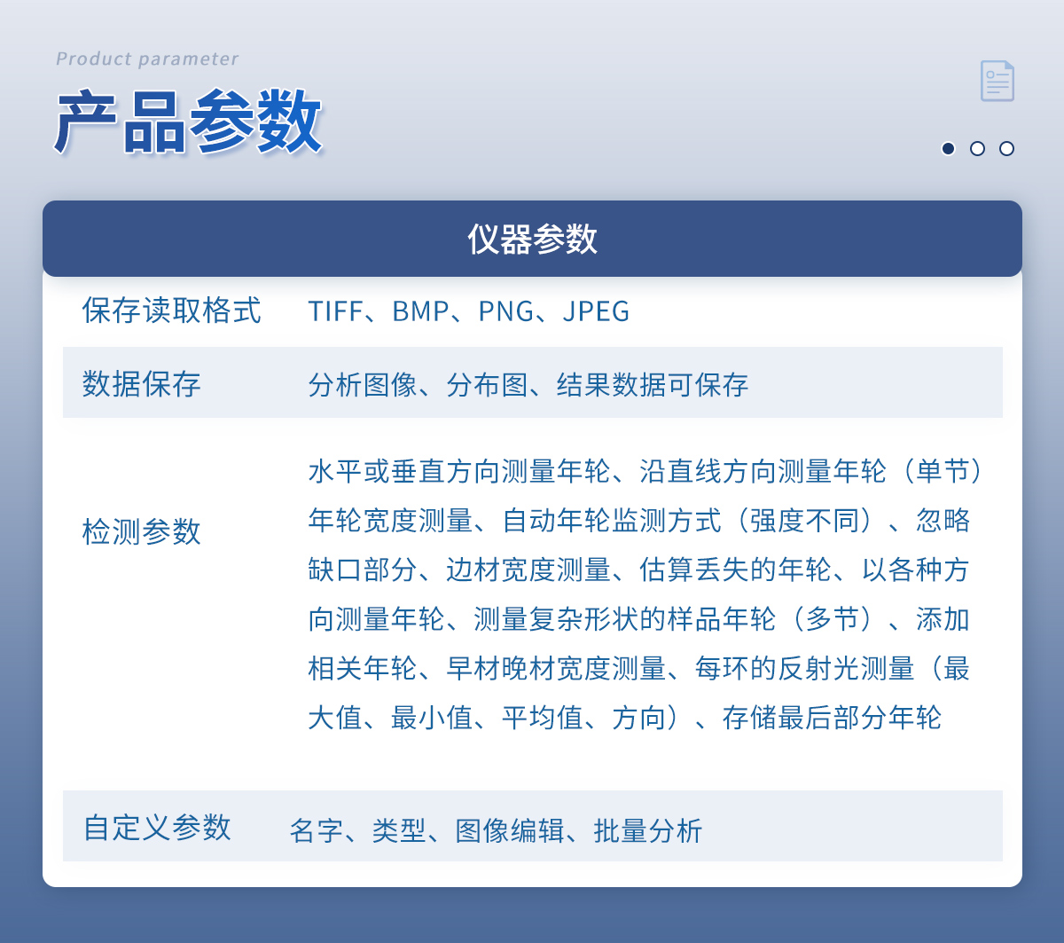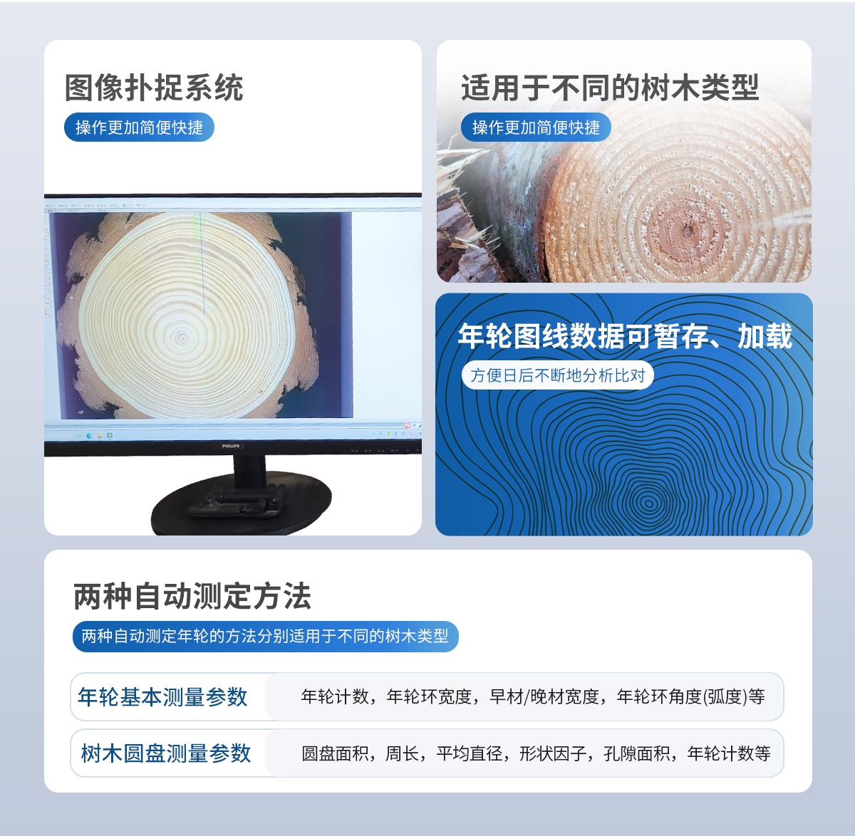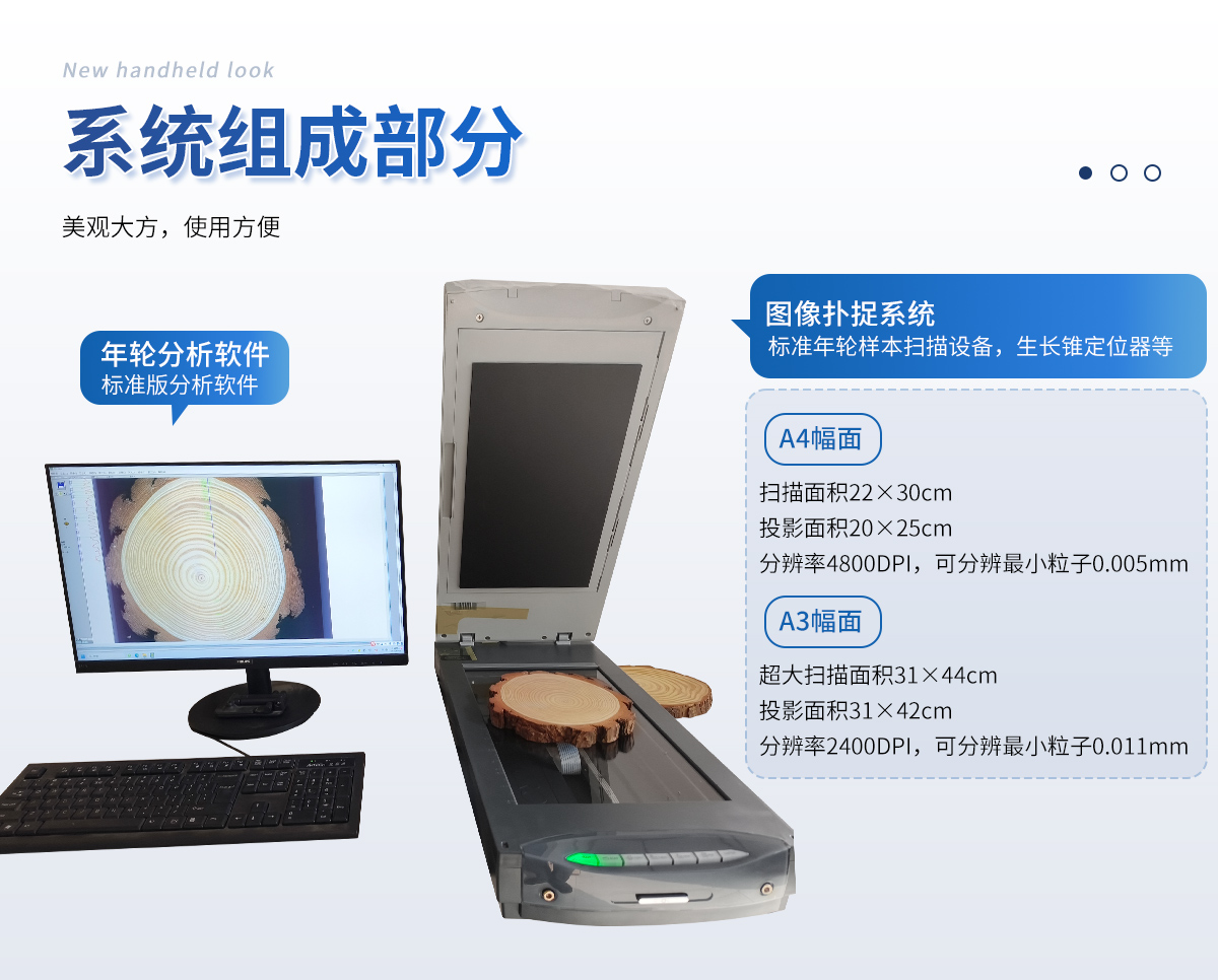 圖像撲捉系統:標準年輪樣本掃描設備,生長錐定位器等。    A4幅面:掃描面積22×30cm,投影面積20×25cm,分辨率4800DPI,可分辨*小粒子0.005mm    A3幅面:超大掃描面積31×44cm,投影面積31×42cm,分辨率2400DPI,可分辨*小粒子0.011mm    年輪分析軟件:標準版分析軟件。