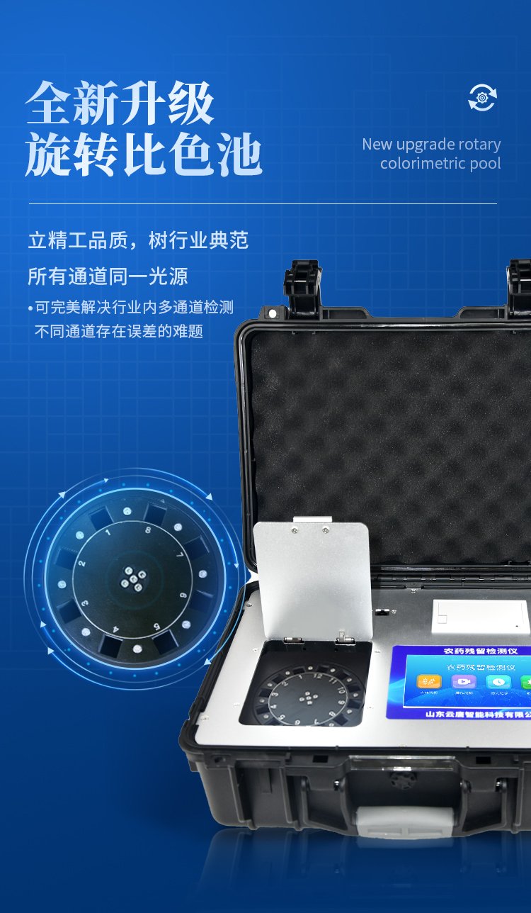 | 機器采用全新安卓智能系統,主控芯片采用 ARM Cortex-A7,RK3288/4核處理器,主頻1.88Ghz,運轉速度更快速,穩定性更強。 | 創新檢測模式: *儀器采用精密旋轉比色池設計,使用光源一致,可以解決各通道間由于光源誤差帶來的檢測結果誤差問題,檢測結果更加精準。 *儀器具有自動識別比色皿檢測功能,即:將樣品比色皿放入儀器后,點擊樣品檢測,儀器自動識別比色皿進行通道檢測。 | 供電方式:交直流兩用,直流 12V 供電,可連接車載電源,可配 6ah 大容量充電鋰電池,方便戶外流動測試。 | 顯示方式:7英寸液晶觸摸屏顯示,人性化中文操作界面,讀數直觀、簡單。 | 檢測通道:8個檢測通道,可以同時測試多個樣品,循環檢測,即放即檢,每個樣品由程序控制分別獨立工作,不會互相干擾。 | 高精光源系統: ①①儀器光源采用進口超高亮發光二極管,光源亮度可以自動調節與校準 ②智能恒流穩壓,光強自動校準,長時間連續工作光源無溫漂現象。 | 智能操作分析系統: ①儀器具有100多種蔬菜名稱菜單庫,分類管理,并可按需添加或刪除、編輯蔬菜名稱;可在同一檢測界面自動對應相關檢測通道一次性選擇1-24個樣品名稱,無需退出界面,節省操作時間。 ②內置新國家限量標準,與所測結果進行現場比對,并持續更新標準。 | 完善的配套硬件: ①采用串口5v打印機,可選擇手動打印或者自動打印,三分鐘出打印結果,打印格式為檢測人姓名、吸光度差值、檢測時間、檢測機構、樣品名稱及結果判定。 ②儀器具有無線上傳模塊,檢測結果可批量打印,批量上傳。 | 數據調用: ①儀器可存儲20萬條檢測結果, ②檢測結果為Excel表格,方便后期進行數據分析與匯總報告 ③儀器采用USB2.0接口設計,支持 U 盤存儲,方便數據的存貯和移動,并可隨時與計算機直接相連,實現數據查詢、瀏覽、分析、統計、打印等。 | 后期產品固件可升級。 | 安全證書,放心保障:儀器具有中國計量科學研究院校準證書,權威認證,使用放心。 |