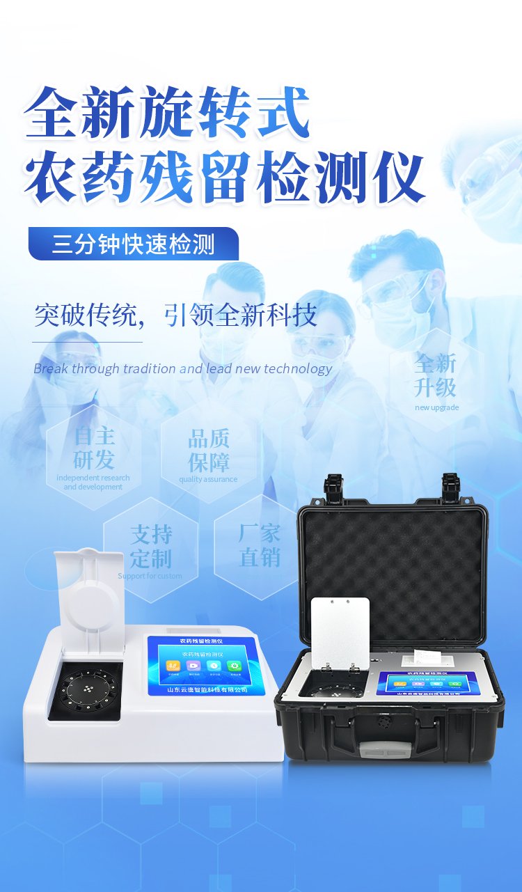山東云唐智能科技有限公司生產的農藥殘留檢測儀廣泛應用于主要用于蔬菜、水果、茶葉、糧食、農副產品等食品中農藥殘留的快速檢測,依據國標GB/T5009.199-2003進行檢測,適用于果蔬茶生產基地以及農貿批發銷售市場現場檢測,餐館、學校、食堂、家庭果蔬加工前的安全速測等。