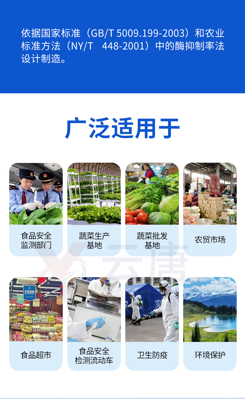 該儀器依據(jù)國家標(biāo)準(zhǔn)(GB/T 5009.199-2003)和農(nóng)業(yè)標(biāo)準(zhǔn)方法(NY/T 448-2001)中的酶抑制率法設(shè)計(jì)制造,能準(zhǔn)確、快速檢測出蔬菜、水果、農(nóng)產(chǎn)品、茶葉等固體或液體中有機(jī)磷和氨基甲酸酯類農(nóng)藥殘留量。廣泛適用于各級食品安全監(jiān)測部門、蔬菜生產(chǎn)基地、蔬菜批發(fā)基地、農(nóng)貿(mào)市場、食品超市、各單位食堂、食品安全檢測流動車、衛(wèi)生防疫、環(huán)境保護(hù)等領(lǐng)域。
