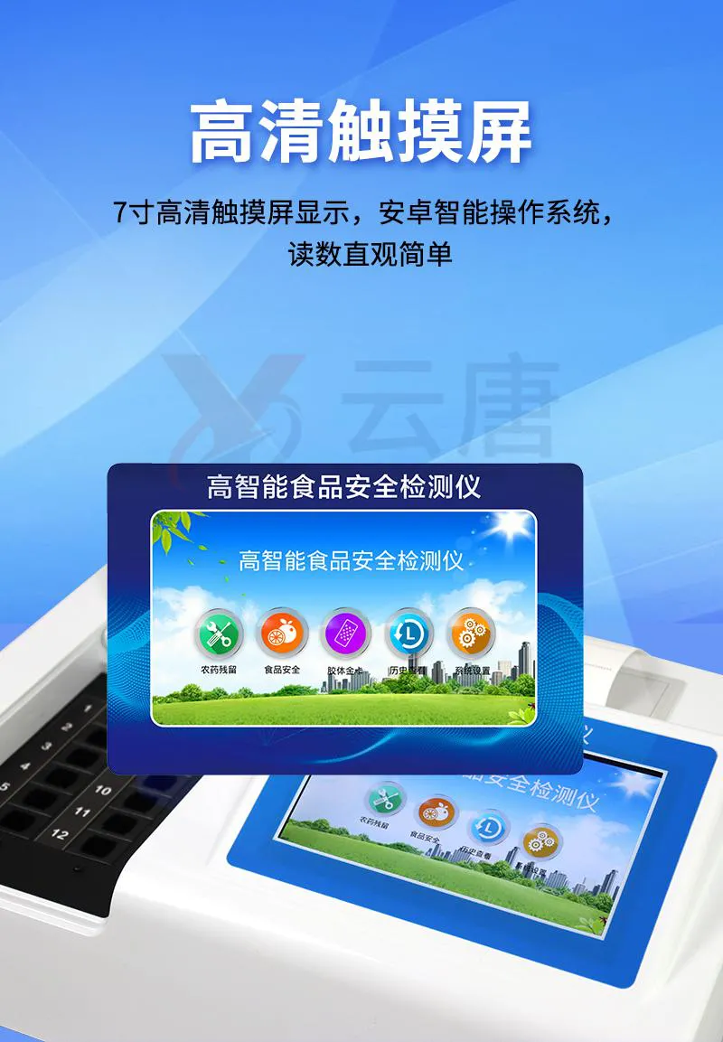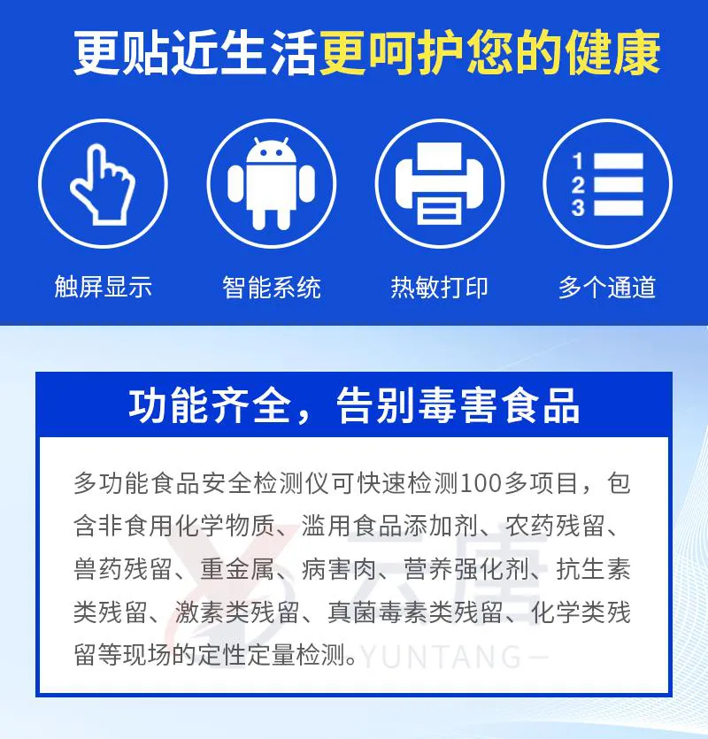 多功能食品安全檢測儀可快速檢測60多項目,包含非食用化學物質、濫用食品添加劑、農藥殘留、獸藥殘留、重金屬、病害肉、營養強化劑、抗生素類殘留、激素類殘留、真菌毒素類殘留、化學類殘留等現場的定性定量檢測。