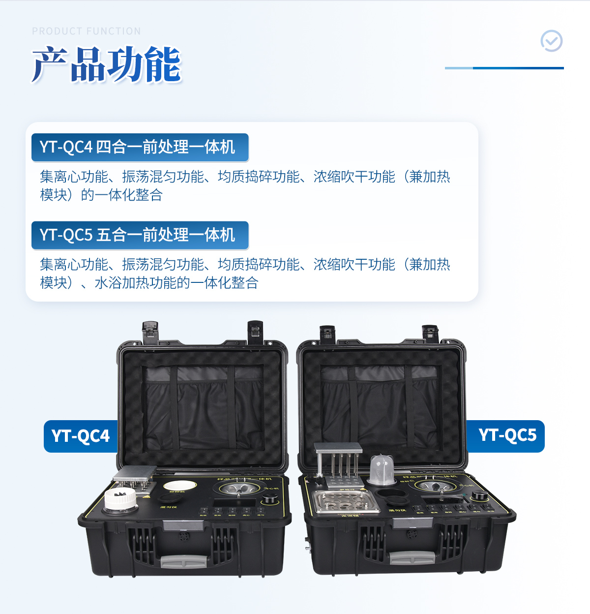應國內用戶的實際需求,自行研制開發的新型儀器——QC05型樣品前處理一體機。樣品前處理集成箱將樣本前處理過程中樣品濃縮、水浴恒溫、離心分層、均質、振蕩混勻等步驟所需設備進行集成,僅需一臺樣品前處理集成箱設備即可完成所有樣本前處理過程,并且方便攜帶,不僅適用于現場檢測使用,還可用于色譜、質譜等分析樣品的純化和制備。