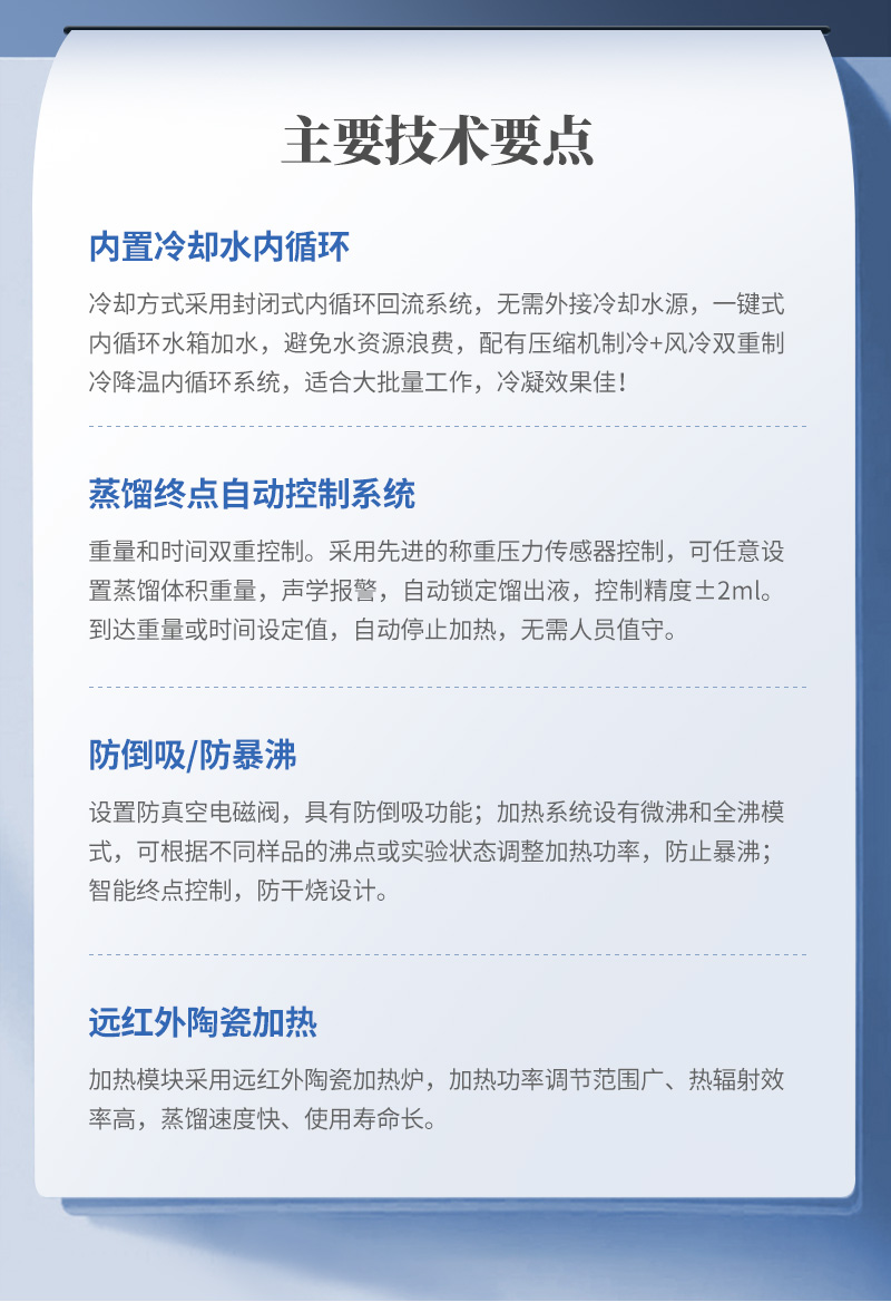 5、蒸餾終點控制:自動偵測蒸餾終點功能,采用稱重和時間雙重控制,蒸餾體積控制在±2ml之內,自動化程度高;